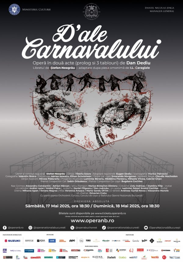 Opera Națională București prezintă premiera absolută a operei „D’ale carnavalului” de Dan Dediu. Libretul și conceptul regizoral aparțin regretatului maestru Ștefan Neagrău, iar adaptarea scenică este semnată de Eugen Dediu. Scenografia poartă semnătura Vioricăi Petrovici, iar coregrafia este realizată de Valentin Stoica. Conducerea muzicală este asigurată de către maestrul Tiberiu Soare, dirijorii corului sunt Adrian Ionescu și Ethan Schmeisser, iar corul de copii este pregătit de Smaranda Morgovan.